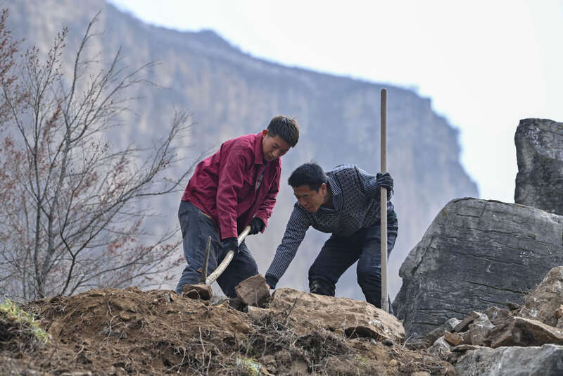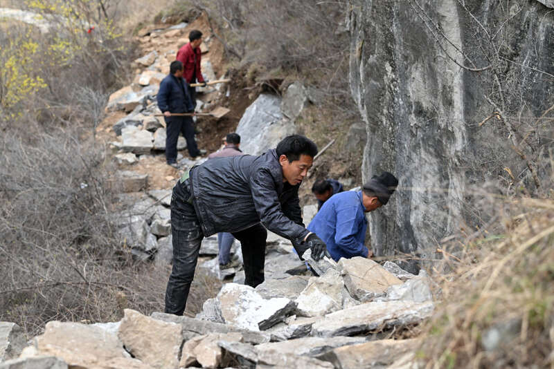 在壶关县大峡谷镇青龙峡村,牛何松(前)和村民们在山上修路(3月23日摄)。
