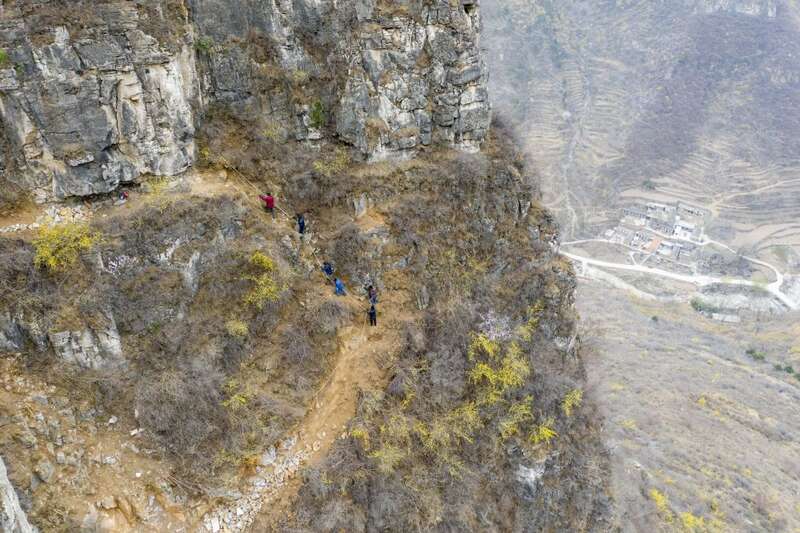 在位于山西省壶关县大峡谷镇青龙峡村的太行山上,村民沿着悬崖上山准备修路(无人机照片,3月23日摄)。