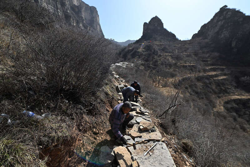在山西省壶关县大峡谷镇青龙峡村,村民在山上修路(3月8日摄)。