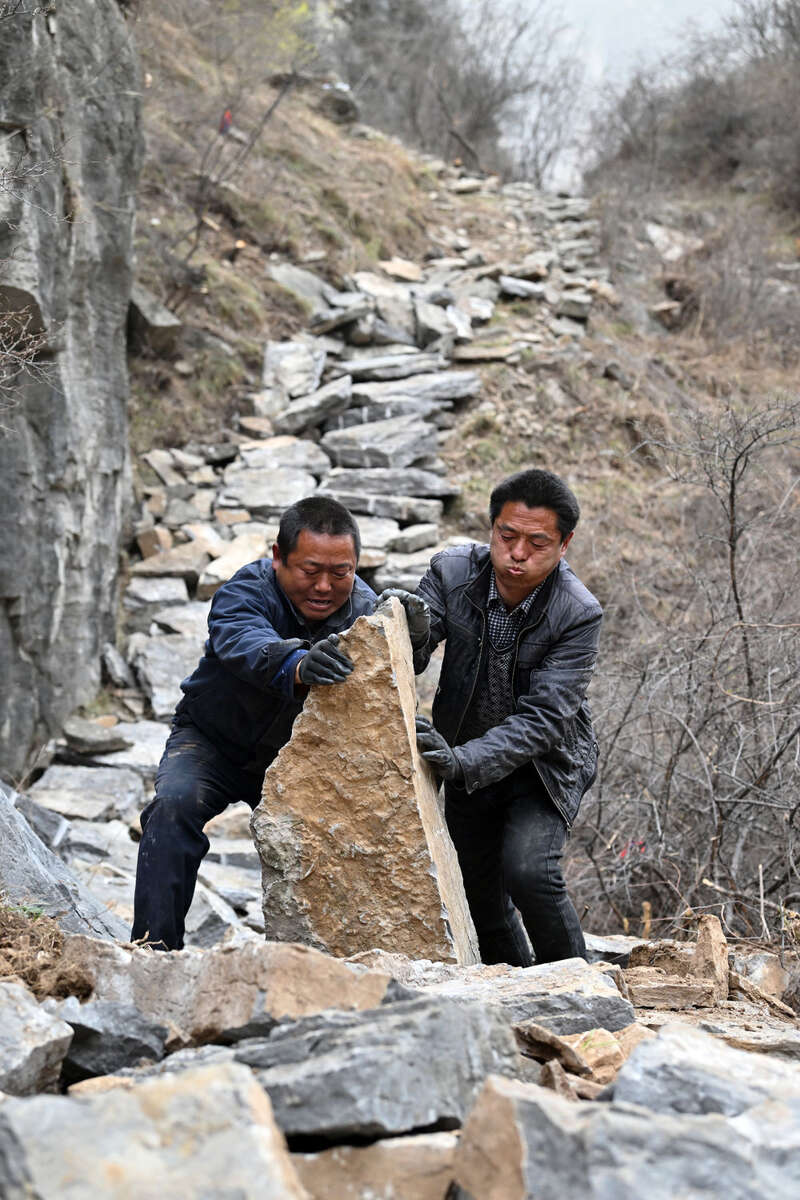 在山西省壶关县大峡谷镇青龙峡村,牛何松(右)和牛永刚在搬运石块(3月23日摄)。