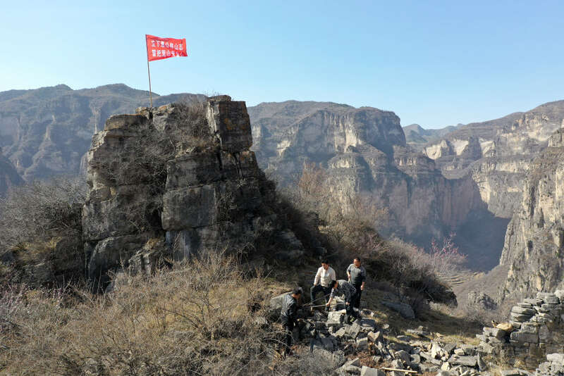在山西省壶关县大峡谷镇青龙峡村,村民们在搬运石头(3月23日摄,无人机照片)。