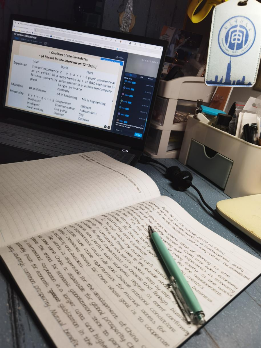 “我其实是一个记性比较差的人,所以我得用录音和拍照把老师课上的教学内容都记录下来。”在课余时间利用课程录音和资料反复复习,直到自己完全掌握了这个知识点。就像冒险故事中的勇者总是通过不断打怪来提升自身水平,印梦可也在一次次的复习和练习中升级。