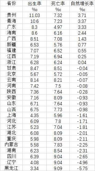 从出生率来看,27个省份中,有12个省份人口出生率超过7‰,这12个省份也超过了6.77‰的全国平均水平。12个省份中,有9个省份来自中西部,只有海南、广东和福建来自东部沿海。