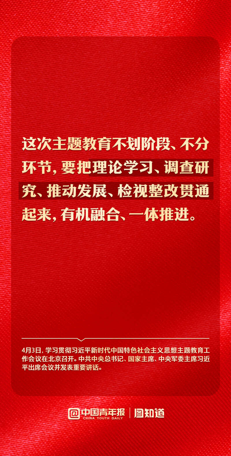 学习贯彻习近平新时代中国特色社会主义思想主题教育工作会议4月3日在北京召开。中共中央总书记、国家主席、中央军委主席习近平指出,以县处级以上领导干部为重点在全党深入开展学习贯彻新时代中国特色社会主义思想主题教育,是贯彻落实党的二十大精神的重大举措,对于统一全党思想、解决党内存在的突出问题、始终保持党同人民群众血肉联系、推动党和国家事业发展,具有重要意义。转存金句,共同学习。