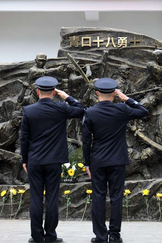 江苏省连云港市公安局开发区分局2名民警自发在青口十八勇士纪念馆向烈士敬礼。郑永波/摄