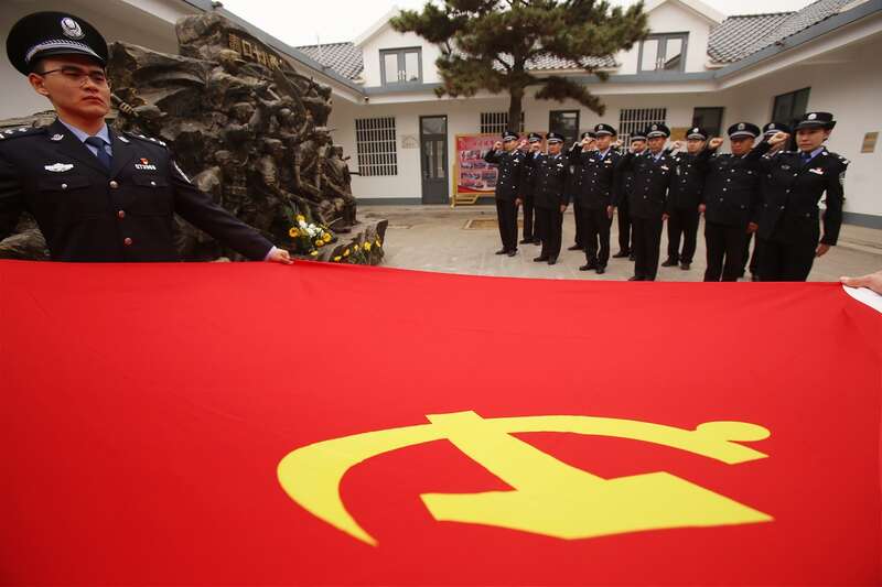 江苏省连云港市公安局开发区分局民警在青口十八勇士纪念馆烈士雕塑前面向党旗重温入党誓词。郑永波/摄