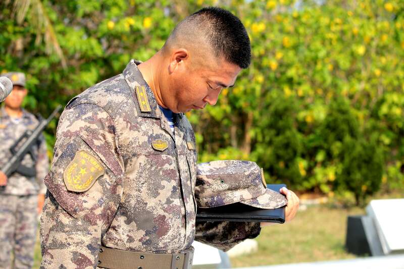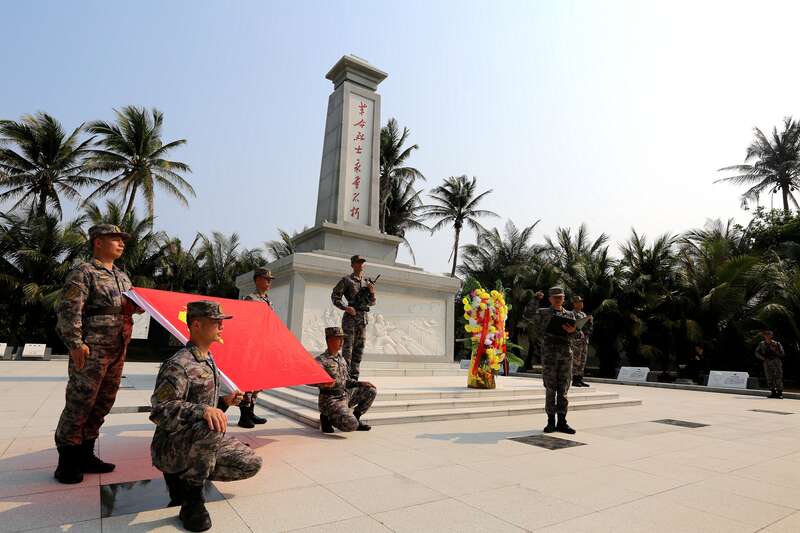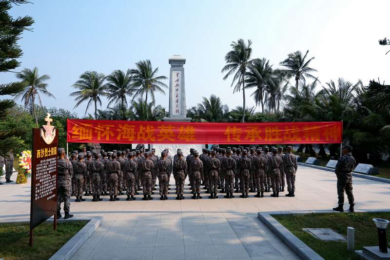 清明前夕,海军西沙某水警区琛航岛官兵举行“缅怀海战英雄、传承胜战精神”祭扫仪式。