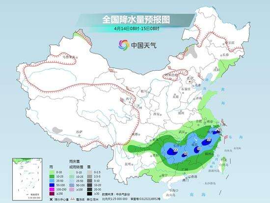 后天,新疆北部、内蒙古中部、西藏南部等地部分地区有小雪或雨夹雪。西南地区东南部、江南、华南北部等地部分地区有中到大雨,其中,湖南中南部、江西中北部、浙江西南部和东北部、福建西北部等地部分地区有暴雨(50~60毫米)。
