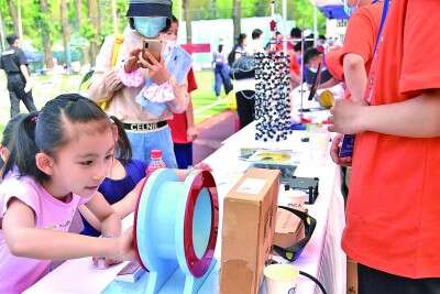 一位小学生在中科院物理所科普活动中体验物理的魅力。光明图片
