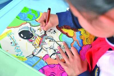 在山东青岛宁安路小学开展的天文知识科普活动上,一名学生在手绘“我的航天梦”。王海滨摄/光明图片
