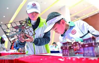 3月4日,在广州黄埔区的航空轮胎大科学中心展览馆,参加研学活动的小朋友在志愿者的帮助下制作建筑模型。新华社发