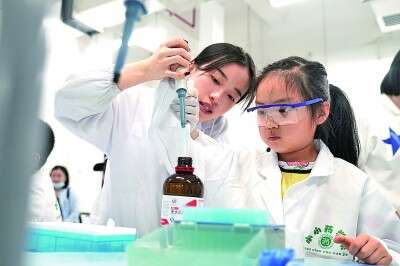 4月16日,在西南大学药学院实验室,孩子们在老师的指导下进行聚集诱导发光实验。秦廷富摄/光明图片