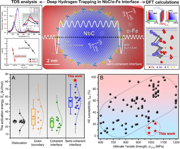 项目组立志从本质上彻底解决氢脆问题,通过氢陷阱的表征、钢中组织观察与解析,系统地揭示了高强钢中浅氢陷阱、深氢陷阱参数,经过持续不断的研究,他们发现“在高强钢生产中尽量去除大颗粒第二相、降低氢含量”的传统观念并不能更好提升材料抗氢脆性能,使氢均匀弥散地分布在晶粒内才是最佳途径。基于此判断,他们创造性地以“可控”思想代替“尽除”观念,利用高分辨透射电镜原子级观察、第一性原理计算模拟及氢脱附实验等方法,全面、系统、深入地研究了纳米相半共格界面深氢陷阱的物理本质,揭示了半共格界面处的失配位错是深氢陷阱的根源,并通过设计纳米析出相深氢陷阱成功抑制了高强钢的氢脆。