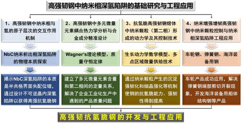 项目组突破了多元微量元素耦合合金设计、精准工艺控制、纳米相形成与构筑纳米相和铁基体半共格界面等关键技术,通过微量元素设计、协同控制纳米颗粒数量与组织、性能等,在高强韧钢熔体、凝固和热处理过程中实现了分温区形成大量弥散分布的纳米析出相,从基础研究、关键技术、产品开发三个维度解决了高强韧钢抗氢脆的重大难题,并成功开发出重大装备用高强韧抗氢脆钢。