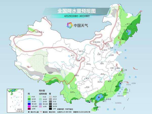 今天,我国大部雨雪稀少,较强降水主要出现在东北、华南等地。中央气象台预计,新疆南疆盆地南部、西藏中东部、青海西南部、内蒙古东北部等地部分地区有小到中雪或雨夹雪。东北地区大部、西藏东南部、四川南部、云南、江南中东部和南部、华南大部、海南岛、台湾岛等地部分地区有小到中雨,其中,吉林东部、福建东北部、广西东部和南部、广东西部等地部分地区有大雨(25~45毫米)。