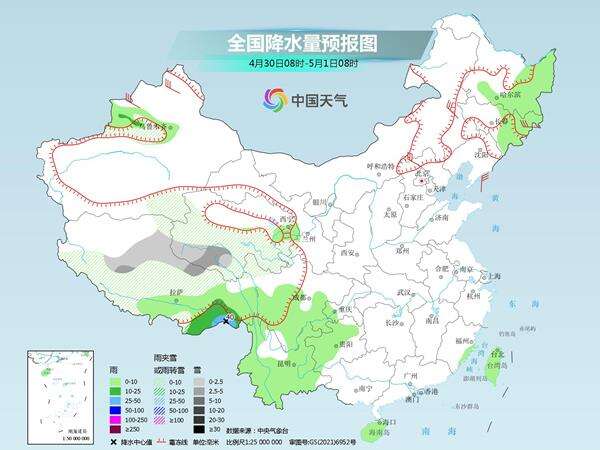 明天,新疆沿天山地区和南疆盆地南部、西藏东部和南部、青海大部、川西高原北部等地部分地区有小到中雪或雨夹雪。新疆伊犁河谷、西藏东南部、东北地区东部、西南地区大部、海南岛、台湾岛等地部分地区有小到中雨,其中,西藏东南部等地局地有大雨(25~40毫米)。