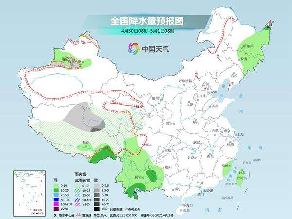 具体来看,中央气象台预计,今天,新疆沿天山高海拔地区、青藏高原大部有小到中雪或雨夹雪,局地有大雪;新疆伊犁河谷、西藏东南部、黑龙江中东部、吉林中东部、四川南部、云南、贵州西部、广西西北部、福建东部、台湾岛等地的部分地区有小到中雨,局地大雨(25~35毫米)。