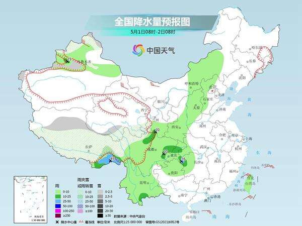 明天,新疆塔城、阿勒泰和沿天山地区、西藏中东部、青海东南部等地部分地区有小到中雪或雨夹雪;新疆伊犁河谷和东部、西藏东南部、甘肃南部、西南地区大部、陕西中南部、山西大部、河北西部和北部、内蒙古中部、湖北西部、湖南西部、台湾岛等地部分地区有小到中雨,其中,西藏东南部等地部分地区有大雨(25~45毫米)。