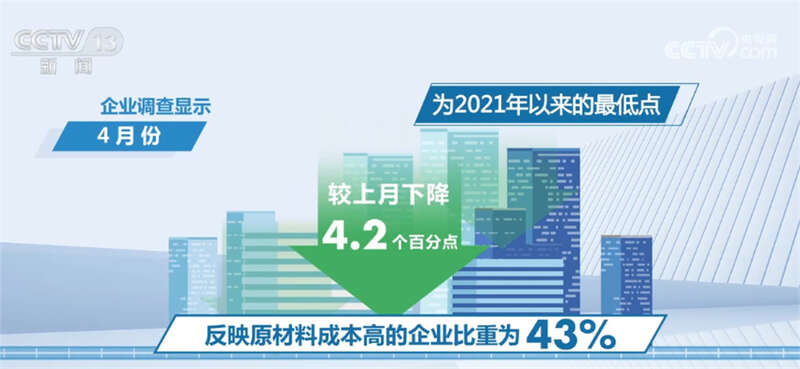 今年以来,原材料成本、物流和劳动力成本普遍回落。企业调查显示,4月份反映原材料成本高的企业比重为43%,较上月下降4.2个百分点,为2021年以来的最低点。反映物流成本高和劳动力成本高的企业比重分别为27.5%和30%,较上月下降1.9和1.1个百分点。