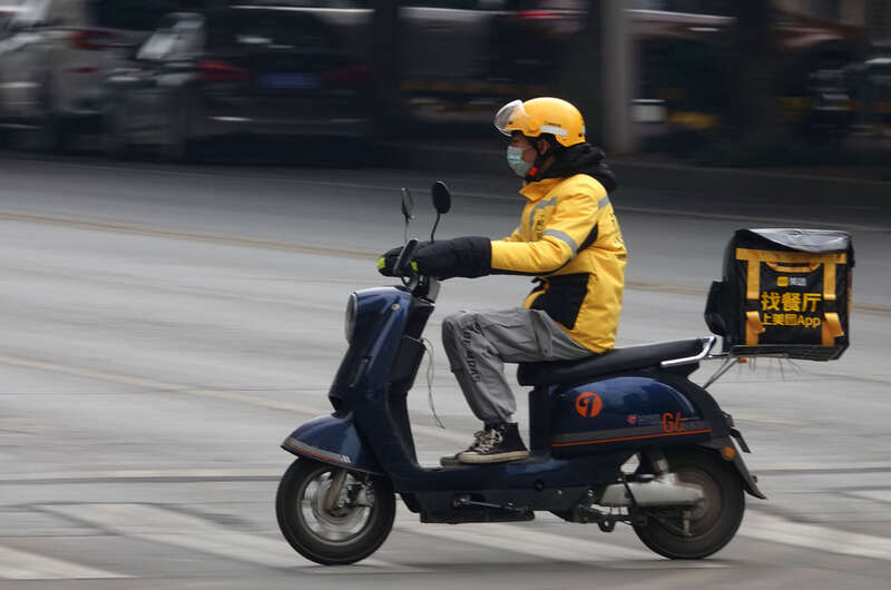 在广西南宁市高新区科德新苑路口,一名外卖小哥驾驶摩托为顾客送餐。 新华社发(喻湘泉摄)