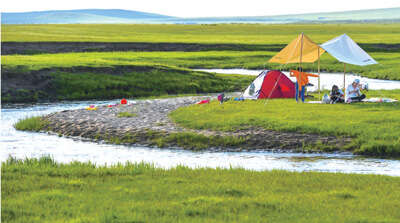 内蒙古自治区锡林郭勒盟西乌珠穆沁旗绿草如茵,游客在河畔露营。