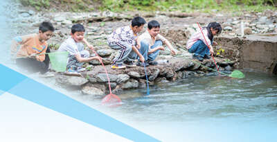 湖南省浏阳市金水河露营基地组织小朋友们打捞河中漂浮物。