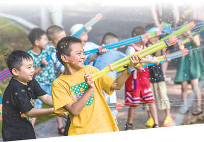 安徽省芜湖市孙村镇一家乡村房车露营地里,小朋友们在开心地打水仗。