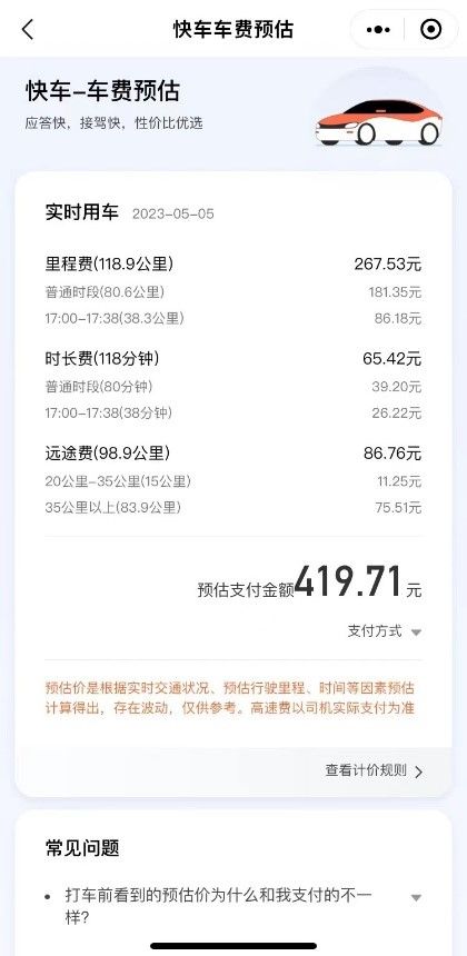 至于网约车,澎湃新闻了解到,打车平台的计费标准中,总计价就已包括了“远程费”。澎湃新闻分别在高德打车、滴滴出行和哈啰出行预订从“上海-苏州”同一起点、终点的网约车,发现不同网约车的预估价明细中,除了里程费和时长费之外,均有一项名为“远途费”的费用。