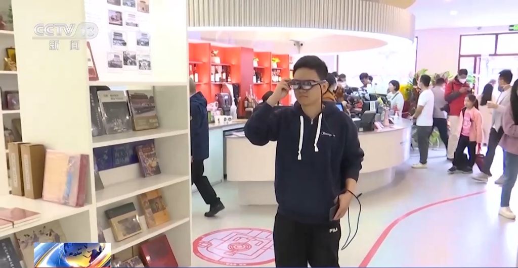 书店空间内还设置了多个点位,顾客戴上AR眼镜后,就可以看到天坛祈年殿等中轴线主要建筑的影像,听到相应的讲解。