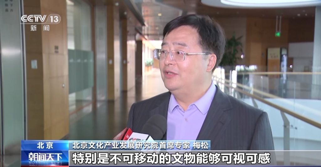 北京文化产业发展研究院首席专家 梅松:让过去不能看、不能见的文物,特别是不可移动的文物能够可视可感,空中鸟瞰,通过数字化技术处理能够完整再现北京中轴线全貌,把存在文档上面、文物上面的历史记忆符号,用数字技术来保存、来处理、来活化。