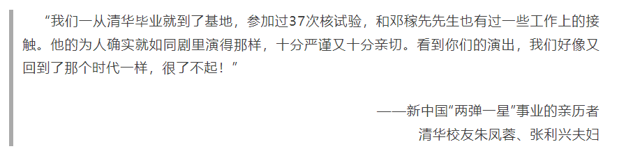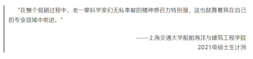 因为花开的故事,是在祖国儿女的接力中盛放的。“我的姨父姨母曾参与'两弹一星'的研制。这次观演让我身边人的经历和老一辈科学家‘干惊天动地事,做隐姓埋名人’的精神更生动地联系在了一起。也而对剧中邓稼先舍小家为大家的选择有了更深的体会——爱国之情和亲情从来都不矛盾,爱国情感的支撑让亲情显得更为可贵。”来自上海交通大学机械与动力工程学院2019级本科生周彦泓对此次观演,有着独特的感悟。