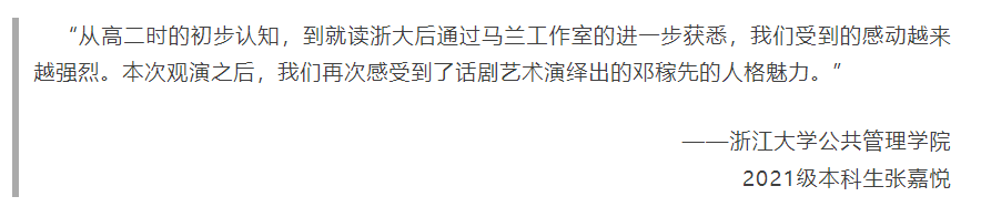 “如果说,浙大的话剧《求是魂》侧重表现竺可桢前辈的经历与品质,那么《马兰花开》讲述邓稼先一生的叙述方式则拉近了我和科研前辈的距离。我在观影过程中真切地体会到了话剧中邓稼先在报国求索过程中的赤忱之心!”观演后,2022级浙江大学竺可桢学院混合2201班本科生胡鑫淼动容地感叹道。