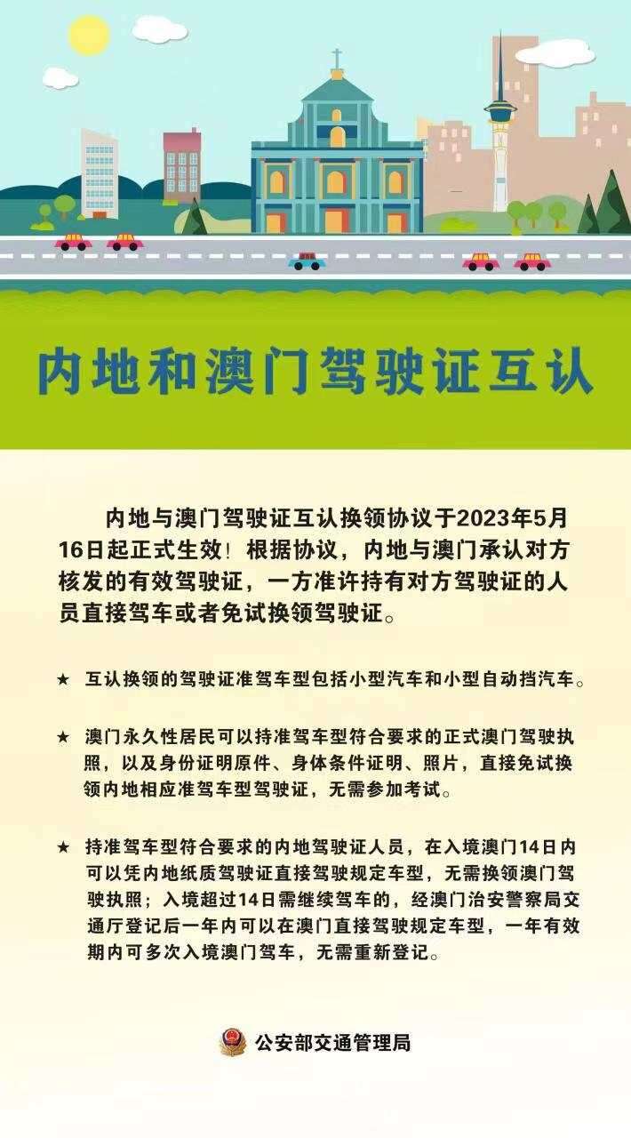 为更好促进粤澳两地交流发展,今年2月,公安部与澳门特别行政区政府签署《内地与澳门关于互认换领机动车驾驶证的协议》,实现内地与澳门驾驶证免试互认换领。该协议于2023年5月16日正式生效。