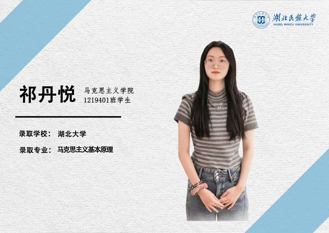 祁丹悦,中共预备党员,马克思主义学院1219401班学生,考研上岸至湖北大学马克思主义基本原理专业。曾获2020-2021年度“国家奖学金”、2021-2022年度“学校特等奖学金”,连续三年荣获一等奖学金及“三好学生”荣誉称号。