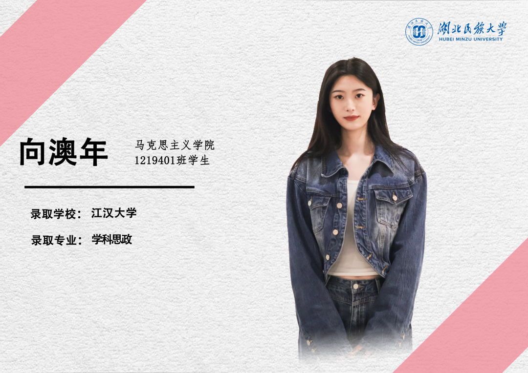 向澳年,共青团员,马克思主义学院1219401班学生,考研至江汉大学学科思政专业。曾担任马克思主义学院学生会权益部副部长。曾获得湖北民族大学第二届“我心中的思政课”微电影竞赛二等奖等荣誉。