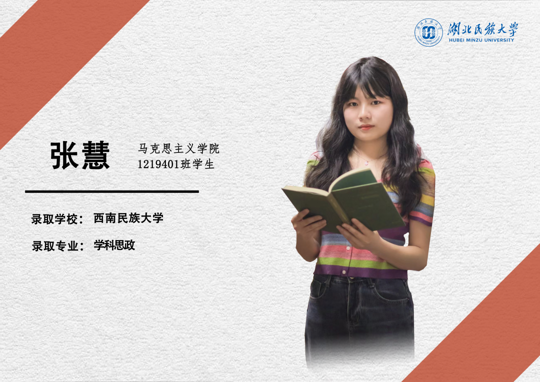 张慧,中共预备党员,马克思主义学院1219401班学生,考研上岸至西南民族大学学科思政专业,曾担任1219401支部团支书,团总支办公室主任。曾获“优秀主讲人”称号;2019-2020学年荣获校级三等奖学金,被评为“三好学生”;2020-2022连续两年被评为“优秀共青团干部”;实习期间荣获“优秀实习队长”称号。