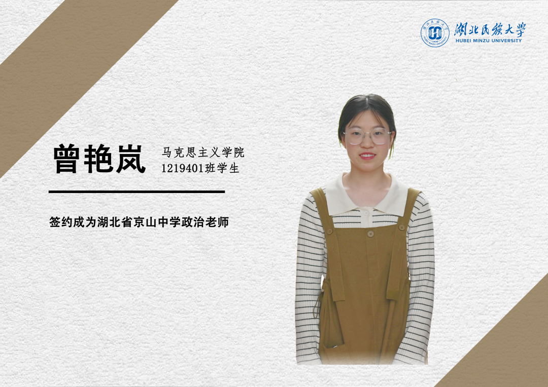 曾艳岚,共青团员,马克思主义学院1219401班学生,已获得高中教师资格证。拥有大学生创新创业项目省级一项、校级一项;荣获湖北民族大学第二届“我心中的思政课”微电影竞赛二等奖。