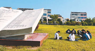 温岭市新河中学雕塑旁,学生们在上户外阅读课。郝天韵摄