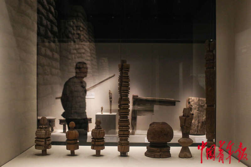 5月20日,新疆和田地区博物馆,参观者从一排木柱头前走过。这些柱头展现着当地建筑的风格特色。中青报·中青网记者 孔斯琪/摄