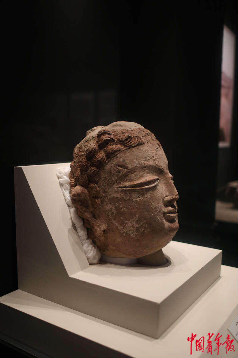5月20日,新疆和田地区博物馆,一件三国至魏晋时期的泥塑佛头像。中青报·中青网记者 孔斯琪/摄