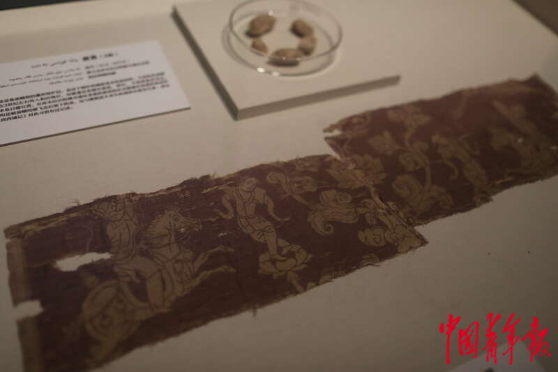 5月20日,新疆和田地区博物馆,一件花卉狩猎纹锦。和田地处新疆塔里木盆地南缘,是古代“玉石之路”和“丝绸之路”的重镇,也是东西方文明交往融合的重要通道。据记载,和田有诸多由中原地区传入的丝织品,加之当地纺织业也发展较快,因此被誉为西域的“绢都”。中青报·中青网记者 孔斯琪/摄