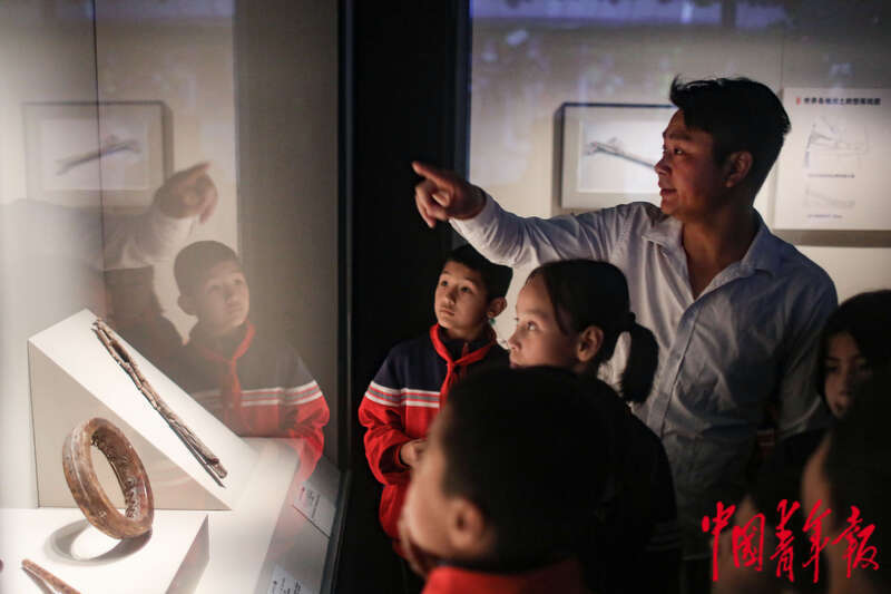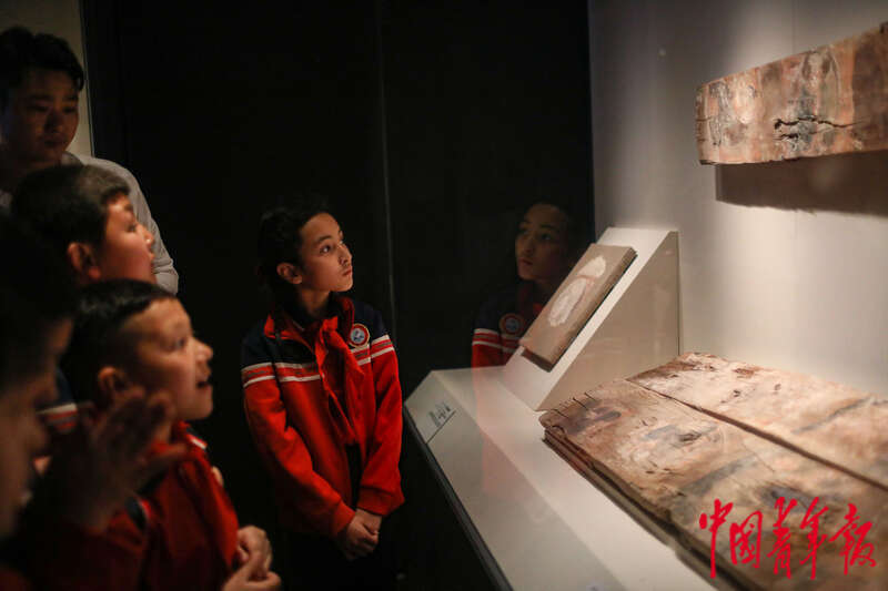 5月20日,新疆和田地区博物馆,来自洛浦县一所小学的学生在参观木板画。中青报·中青网记者 孔斯琪/摄