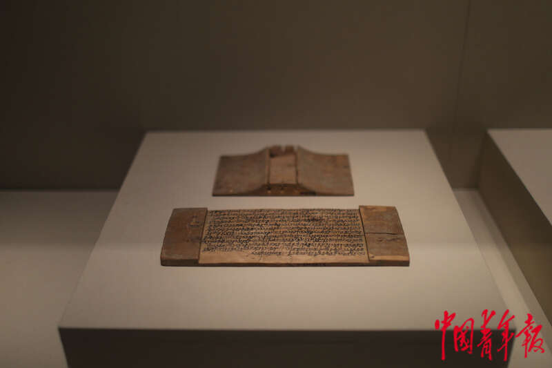 5月20日,新疆和田地区博物馆,民丰县尼雅遗址出土的佉卢文“萨迦牟云的庭审判决书”木牍。佉卢文是中国新疆地区最早使用的民族古文字之一,起源于古代犍陀罗。尼雅遗址位于塔克拉玛干沙漠南缘尼雅河下游尾闾地带,是新疆古文化遗址中规模现存最大且保存状况良好又极具学术研究价值的大型聚落遗址之一,被称为“东方庞贝”。通过尼雅遗址出土的佉卢文文书,我们可以了解到当时的社会生活与人情风貌。中青报·中青网记者 孔斯琪/摄