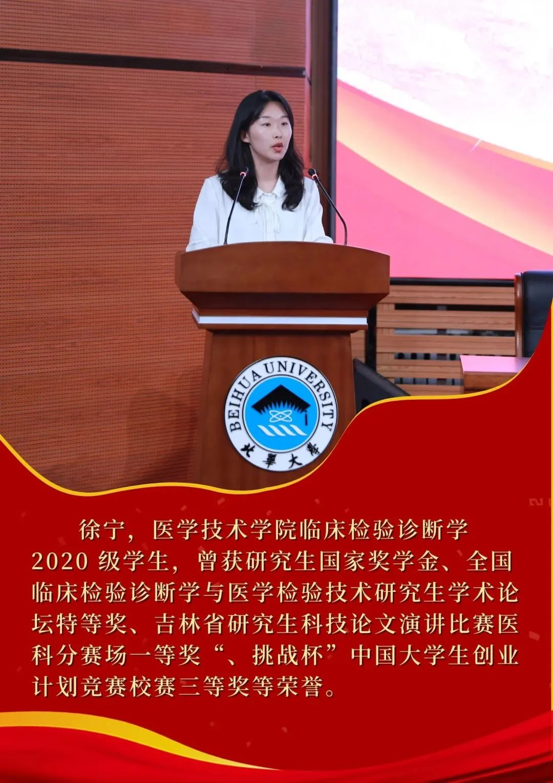 以后的日子里,我会带着母校的嘱托与期盼,继续发扬北华人自强不息、不怕困难、追求卓越、勇于奉献、在困境中崛起的精神。作为一名即将步入工作的医学生,更会谨记:除人类之病痛,助健康之完美的神圣使命,为医学事业奋斗终身。