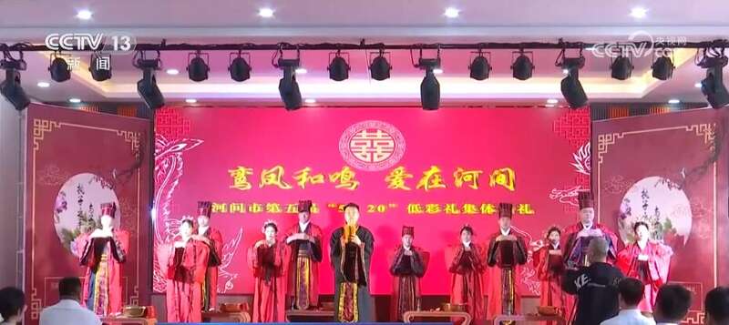 在江西贵溪、山东巨野等地,五月份组织了多场主题为“不要彩礼要幸福”的集体婚礼,倡导新人们选择简约的婚礼仪式。在河北省河间市的集体婚礼现场,红毯艳艳、丝竹袅袅,新人们身着传统礼服,在证婚人、主婚人的见证下,按照周制汉婚的传统仪式开启他们爱的旅程。