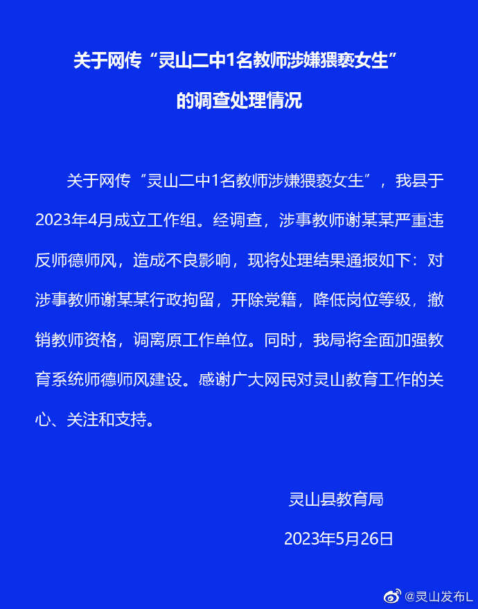 灵山县教育局5月26日回应网传“灵山二中1名教师涉嫌猥亵女生”称,我县于2023年4月成立工作组。经调查,涉事教师谢某某严重违反师德师风,造成不良影响,现将处理结果通报如下:对涉事教师谢某某行政拘留,开除党籍,降低岗位等级,撤销教师资格,调离原工作单位。同时,我局将全面加强教育系统师德师风建设。