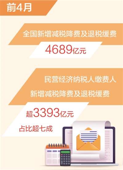 人民日报北京5月26日电 (记者王观)5月26日,国家税务总局举行例行新闻发布会介绍,前4月全国新增减税降费及退税缓费4689亿元。其中,两批延续优化创新的税费优惠政策3083亿元,其他政策如增值税留抵退税等1606亿元,有力减轻了各类经营主体负担,进一步激发各类经营主体活力。