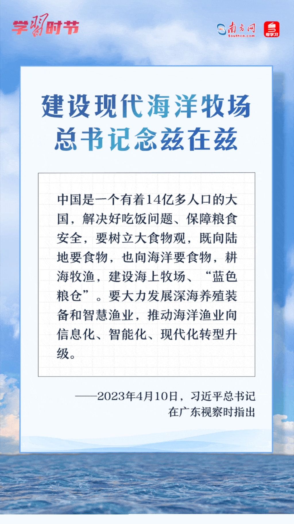 发展海洋渔业,既是建设海洋强国的重要一环,也是确保粮食安全的重要一环。2023年4月10日,习近平总书记在广东视察调研的首站,来到湛江。海洋种业研发、海洋渔业发展……总书记关切这些“国之大者”,念兹在兹。