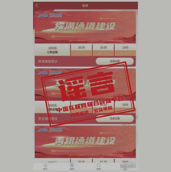 真相:近期,中国国家铁路集团有限公司接到群众来电咨询,反映一款名为“八纵八横”APP程序自称是国铁集团授权推出的理财产品,设有“呼南通道建设”“沿海通道建设”“京兰通道建设”等9款投资理财项目,并将国铁集团公司简介、新闻报道等内容在APP中用于宣传推广。对此,国铁集团发布严正声明称,国铁集团及所属单位从未授权或利用其他网站、APP、微信公众号、微博等形式以“国铁集团”或“中国铁路”的名义销售投资理财产品,也没有通过这样的方式筹集铁路建设资金。不法分子利用“八纵八横”APP程序所实施的行为和发布的内容已涉嫌诈骗,请公众提高警惕,谨慎区分,注意防骗。如已被骗,请立即向公安机关报案。(来源:“中国铁路”微信公众号)
