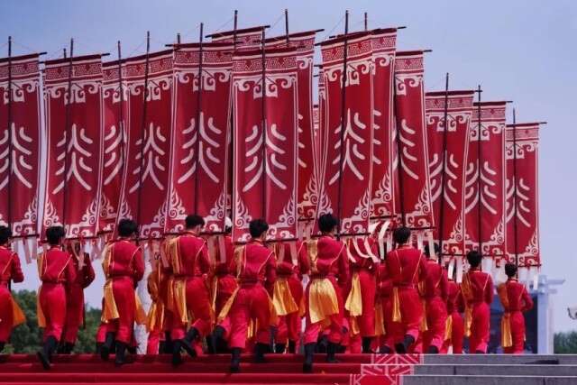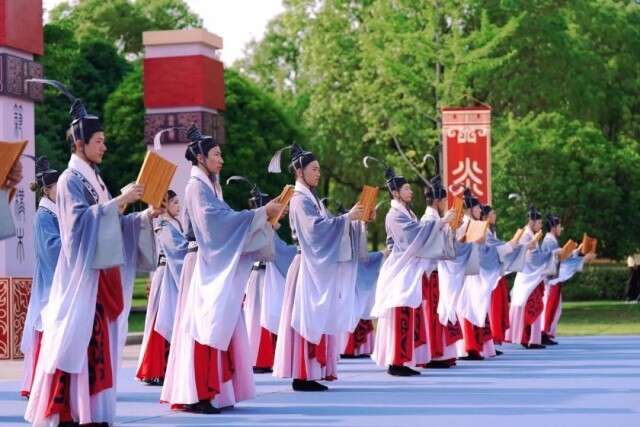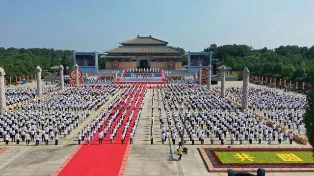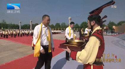 击建鼓、鸣编钟,声震九州,音传古今,拜祖仪式在隆重庄严的氛围中拉开序幕。仪式依据古时雅乐体系,参考历朝历代祭祀音乐、诗经乐谱等,融合曾侯乙遗址出土的编钟、编磬、鼓、箎、笙、琴、瑟、排箫等八种乐器,创新编排大典音乐。